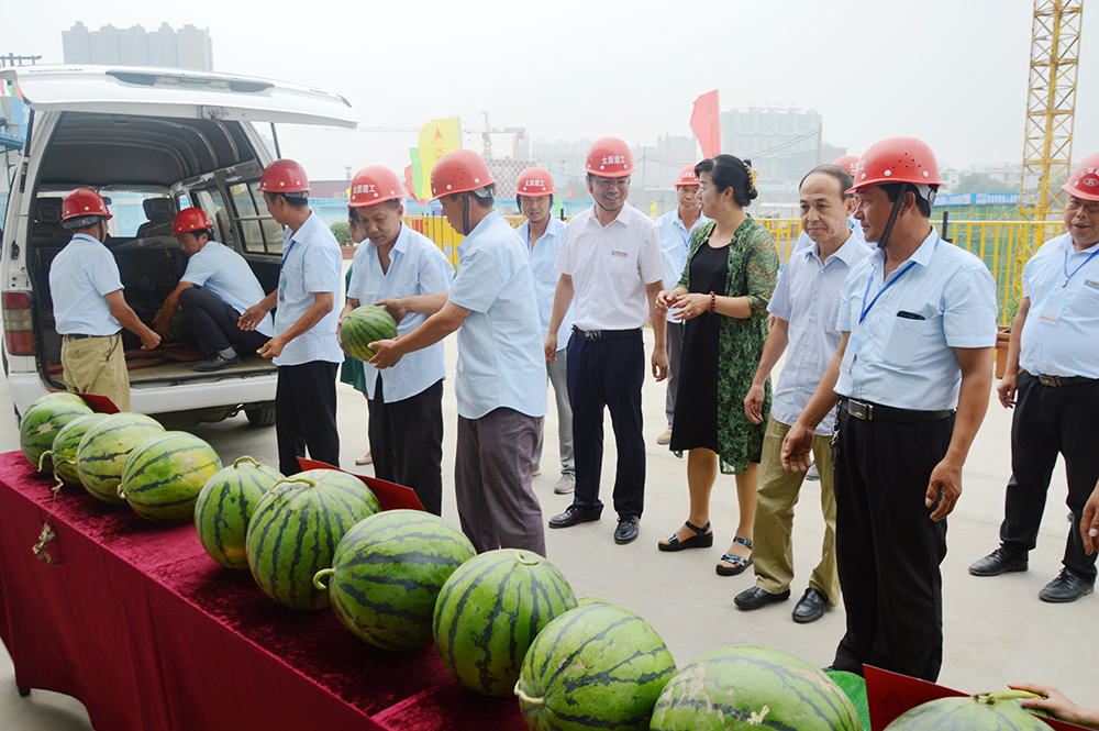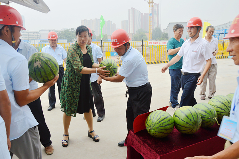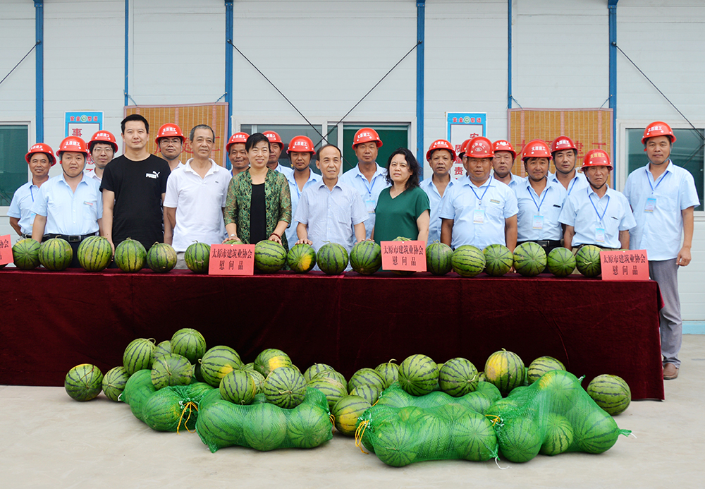 7月18日上午,炎炎夏日,驕陽似火。市建協(xié)秘書長劉紅梅、工程部長張建平等協(xié)會(huì)領(lǐng)導(dǎo)一行五人,帶著滿滿的一車西瓜和對(duì)務(wù)工人員的關(guān)愛,來到集團(tuán)公司承建的太原市小北關(guān)棚戶區(qū)改造安置用房項(xiàng)目部進(jìn)行“夏季送清涼”慰問。